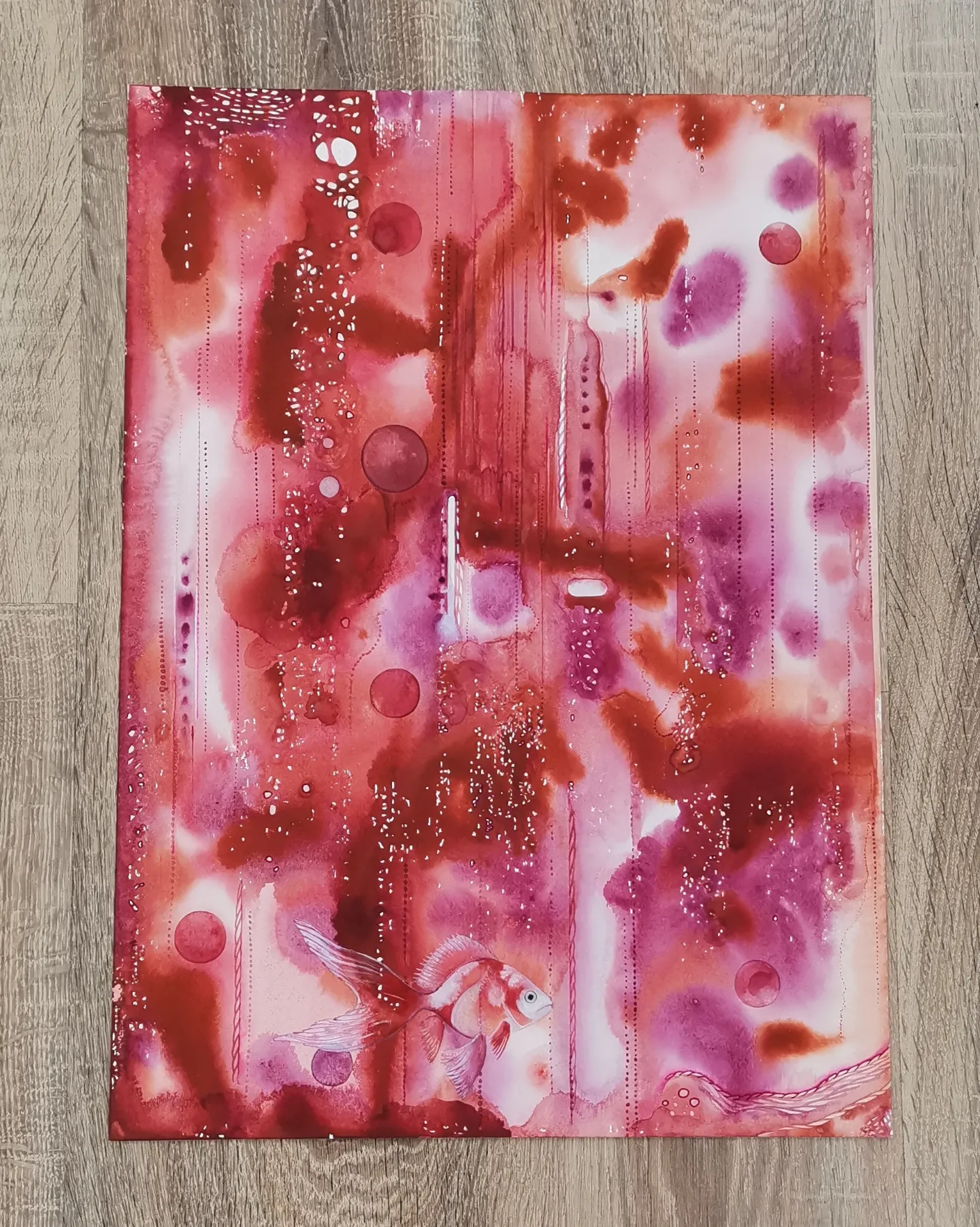 “Rosso II il pesce mimetico” acquarello su carta Arches 100% cotone, opera unica dell’artista Ilaria Finetti. Dimensioni cm 36×50.