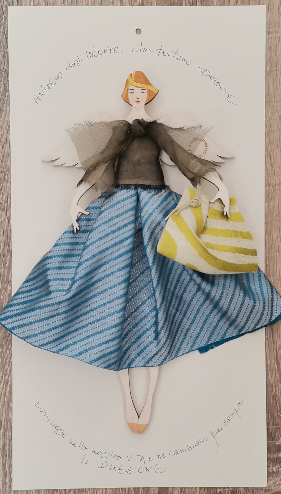 “Angelo degli incontri” angelo realizzato a mano in legno di faggio, stoffe e carta dall’Oca Bianca ed altre storie. Prodotto italiano. Dimensioni del cartoncino cm 30×16.
