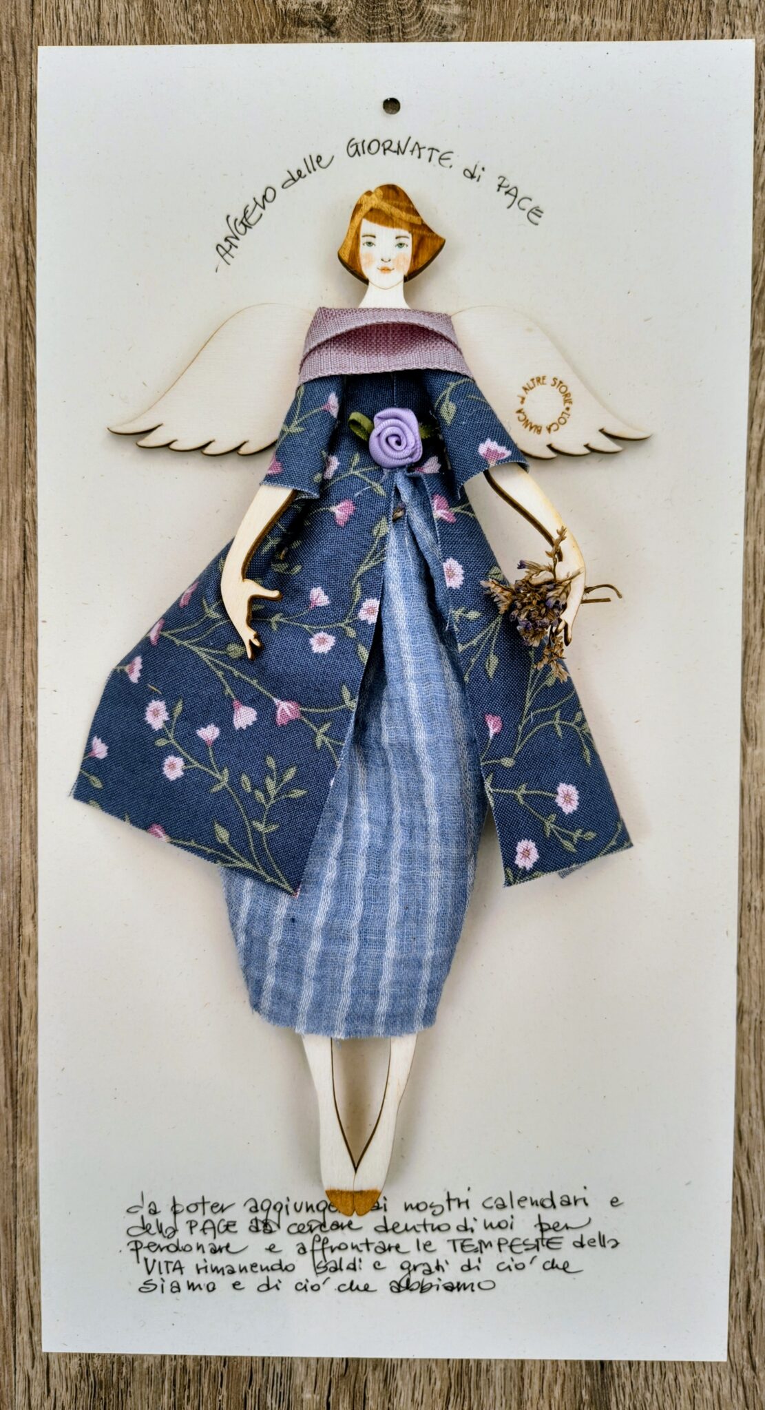 “Angelo delle giornate di pace” angelo realizzato a mano in legno di faggio, stoffe e carta dall’Oca Bianca ed altre storie. Prodotto italiano. Dimensioni del cartoncino cm 30×16.