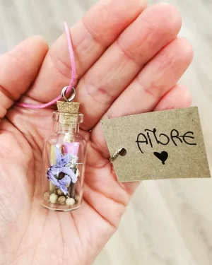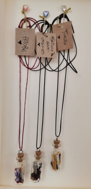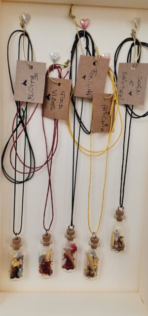 Serie di collane realizzate con fiori ed essenze all’interno della bottiglietta, ed un messaggio dedicato ad uno stato d’animo o un proposito.