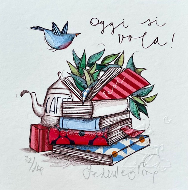 “Oggi si vola!” stampa in fine art, giclèe retouchè ad edizione limitata, numerata e firmata dall’artista Federica Porro. Dimensioni cm 14×14.