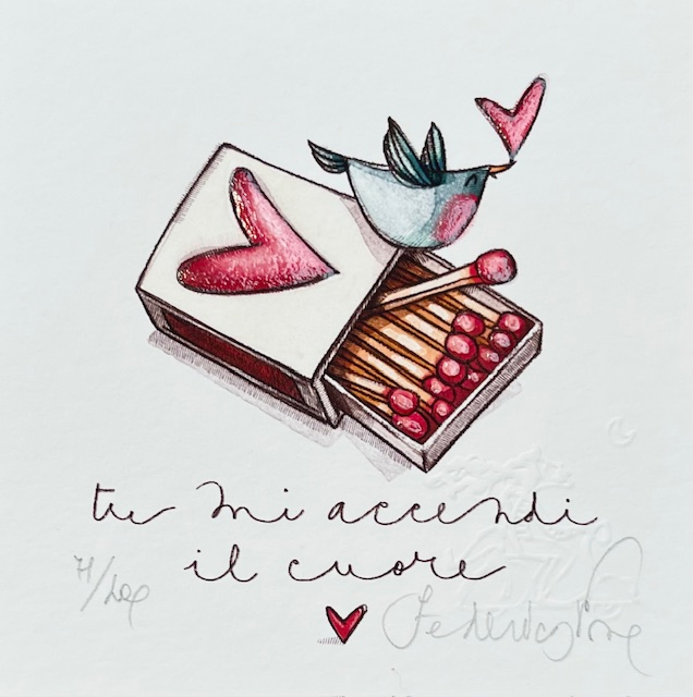 “Tu mi accendi il cuore” stampa in fine art, giclèe retouchè ad edizione limitata, numerata e firmata dall’artista Federica Porro. Dimensioni cm 14×14.